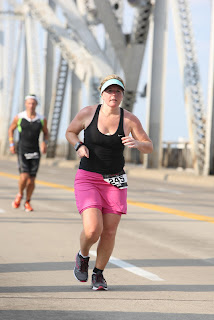 I ran out onto the street trying to tell myself that the first half a mile running after biking is the hardest. My legs were not having it. I quickly remembered that I did not stretch my legs before starting. I always stretch my legs and know how badly things can go when I do not. My legs were burning. I stopped and stretched on a curb on the bridge. The run is an out and back on one of the bridges and then a double out and back.